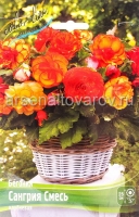 Бегония Сангрия Смесь многолетняя травянистая смесь гибридов. Куст, высотой 25 см, компактный, сильноветвящийся. Соцветия крупные, густомахровые, бахромчатые, красно-желтый в разных комбинациях, с лёгким ароматом, диаметром 10-15 см. Цветение обильное и продолжительное с июня по октябрь. Место расположения: солнце, полутень. Рекомендуется легкая плодородная почва со слабокислой реакцией. Высаживать клубни бегоний в открытый грунт рекомендуется в конце мая на глубину 3-5 см с расстоянием между растениями 15-20 см. Необходим обильный полив в период вегетации и умеренный в период цветения. Используются на клумбах, рабатках, в групповых посадках, для озеленения балкона или помещения как горшечная культура. Клубни бегоний рекомендуется выкапывать и хранить во влажном песке или торфе. Предпочитают тепло и влагу, но не терпят переувлажнения. Отличаются стойкой до самых морозов окраской. Размножаются делением клубней, черенками и семенами.
