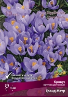Крокусы крупноцветковые - это очень плодовитые неприхотливые растения, которые украшены действительно крупными бокаловидными цветками: в среднем раза в 2 крупнее, чем у диких предков. Многие гибриды различаются незначительными деталями окраски или размером, что становится заметным только при совместном выращивании. Окраска бывает белой, всех оттенков сиреневого, лилового и фиолетового цвета и двуцветная так называемая сетчатая или полосатая.Гранд Мэтр - высота растения 15 см. Цветы крупные фиолетово-голубой окраски.Месторасположение: хорошо развиваются на освещенных, прогреваемых солнцем местах. В тени цветки не раскрываются полностью.Почва: предпочитают рыхлые водопроницаемые питательные почвы.Посадка: Лучшее время для посадки - август-сентябрь, когда растения находятся в покое. Сажают луковицы по общему правилу: если в рыхлую почву, то на глубину, равную двум луковицам, если в тяжелую - на глубину одной. Но в любом случае не мельче чем на 5 см.Цветение: март - апрель.
