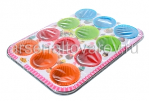 Форма для выпечки стальная с антипригарным покрытием 350*270 мм на 12 кексов + 12 силиконовых форм (Р-324) (КНР) 113352