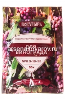 Удобрение для винограда Богатырь улучшает качество ягод, повышает сопротивляемость болезням и устойчивость к заморозкам.Применение:Полив - 20-30 г/10 л воды, расход - 10-20 л/куст.Опрыскивание - 2-3 г/1 л воды, расход - 1,5-2 л/10 кв.м.Когда: начиная с фазы формирования грозди - каждые 10-15 дней.Кратность: 2-3 раза за сезон.